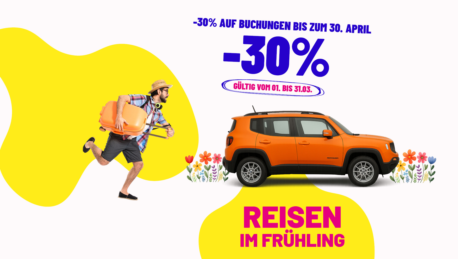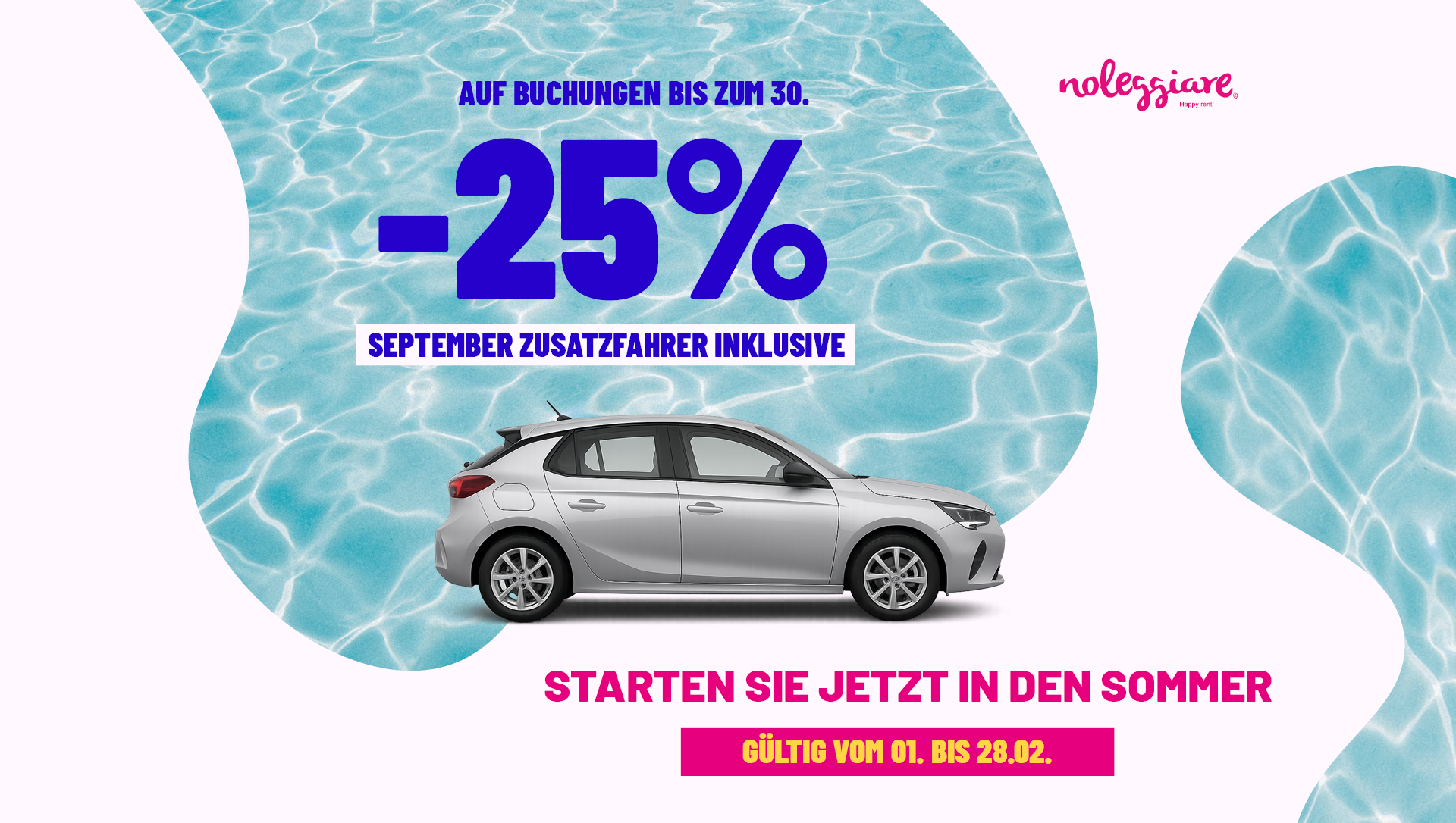 Buchen Sie Ihr Auto: 30% Rabatt und einen zweiten Fahrer kostenlos.