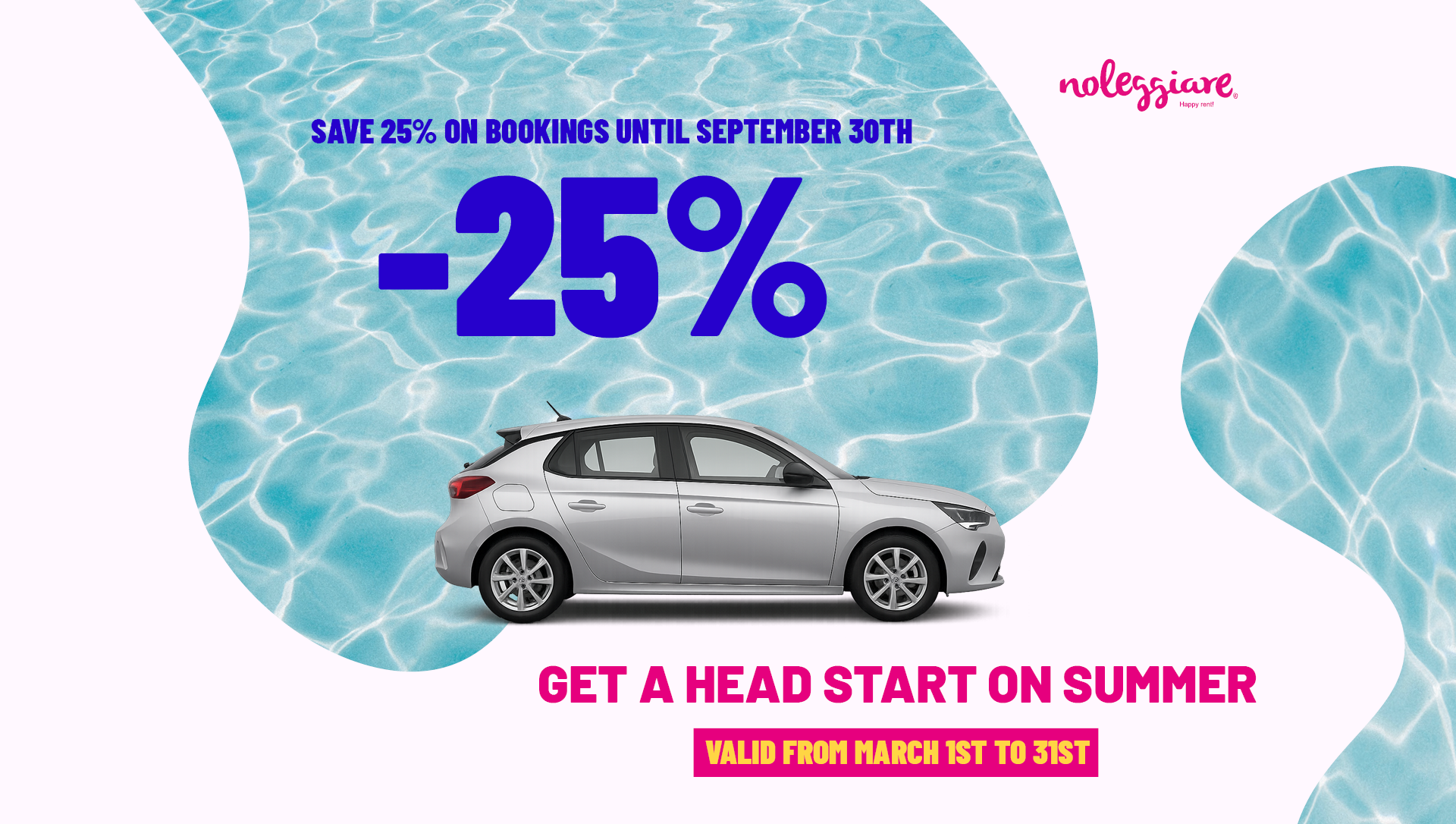 Promotions Book your car at the best price online for your next italian vacations with Noleggiare. UPCOMING TRIP? 35% OFF Book from February 1st to 28th and travel until April 30th, Easter included. Book now Beat the summer rush, save more From March 1st to 31st , get 25% off your car rental. Start your journey Rent with our GOLD coverage Enjoy your travel and save 30% Book right away Noleggiare Loves Planet Rent an hybrid or 100% electric car and save 40%. Start your journey